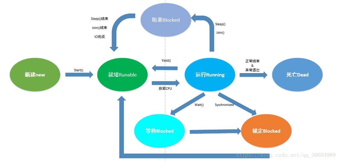 通过调用线程的sleep()或join()或发出了I/O请求时,线程会进入到阻塞状态。当sleep()状态超时、join()等待线程终止或超时、或者I/O处理完毕时,线程重新转入就绪状态。