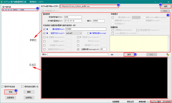 打开 Kcptun 启动工具,界面如下,请按序号操作。