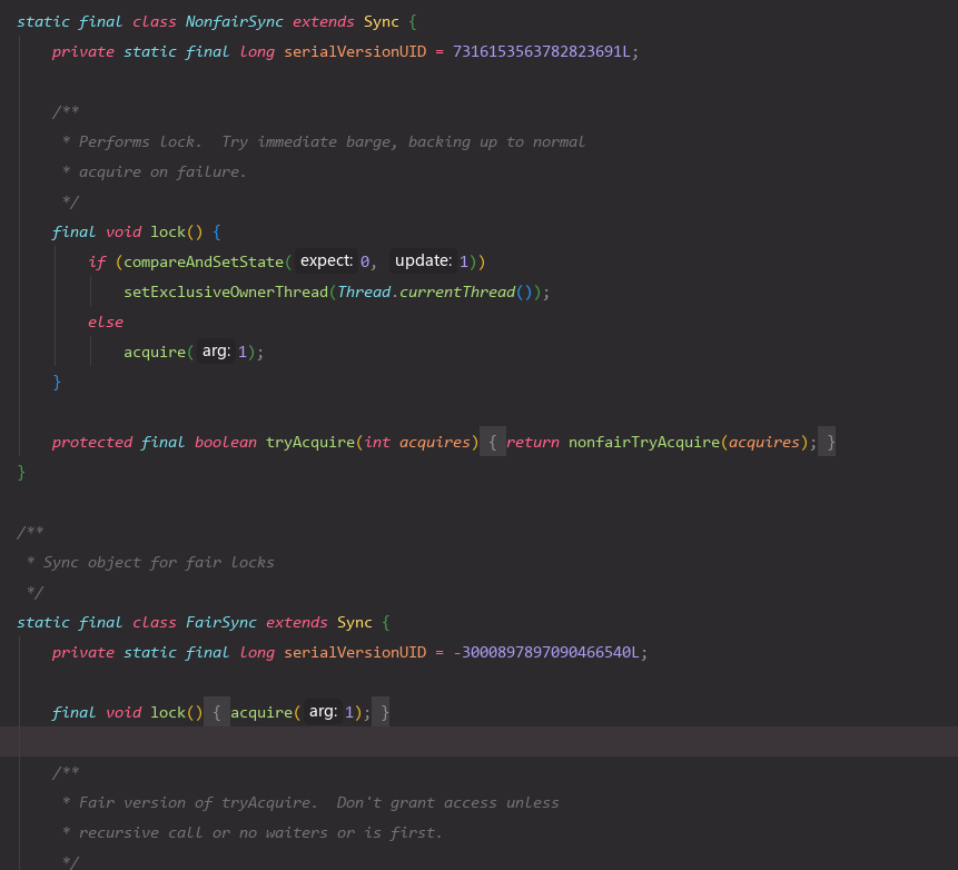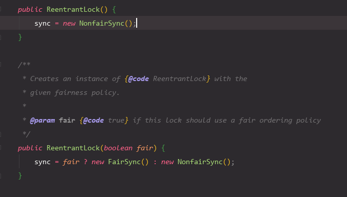在ReentrantLock中定义了2个静态内部类,一个是NotFairSync,一个是FairSync,分别用来实现非公平锁和公平锁。 我们可以在创建ReentrantLock对象时,通过以下方式来设置锁的公平性: