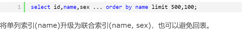 - 如果不是基于主键索引的,使用的是普通索引的,那么就要使用索引覆盖:select id from user where name=‘xxx’ limit 10000, 10 依据普通索引的特性,先查出id,然后通过id在去查询数据。