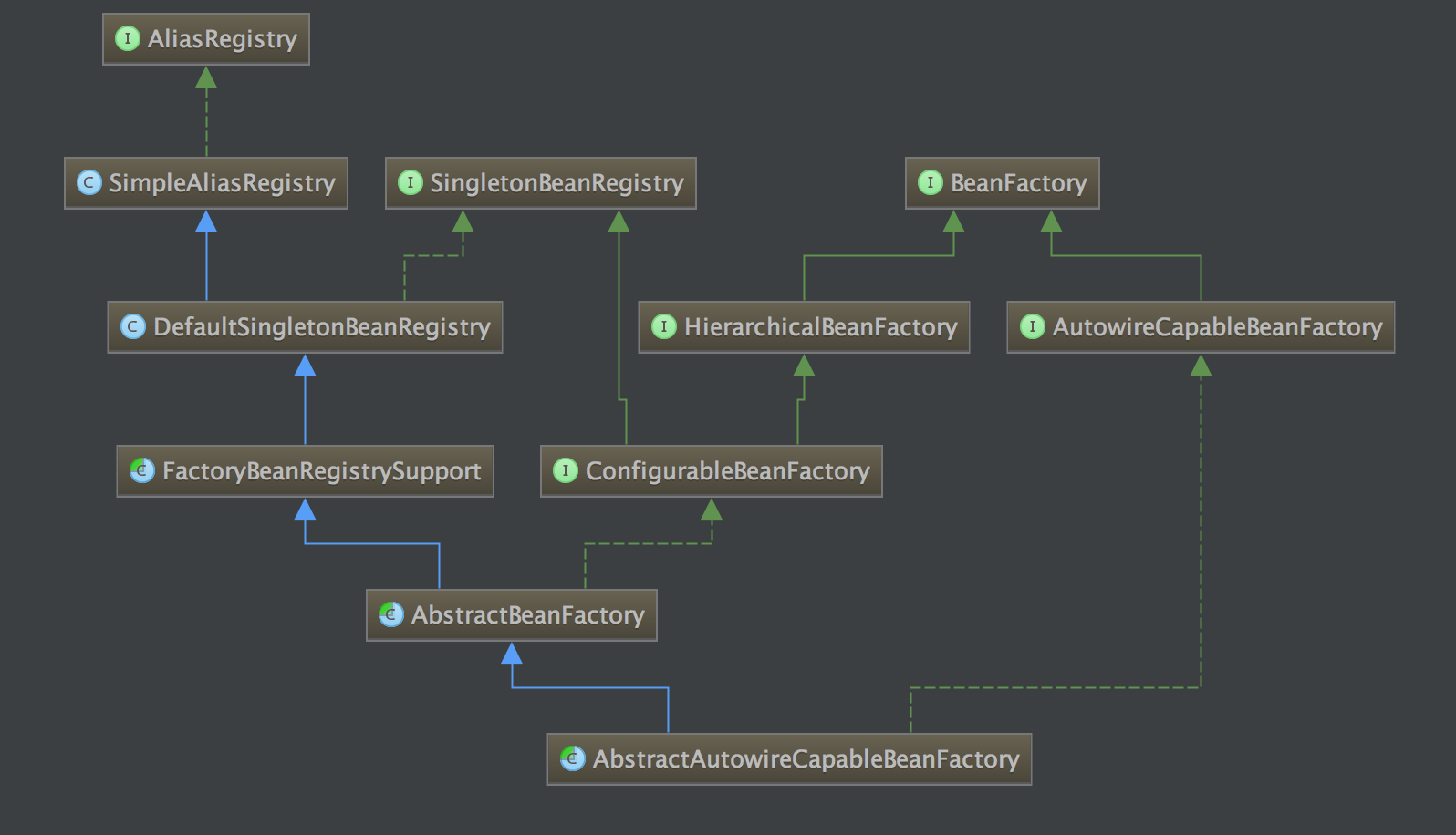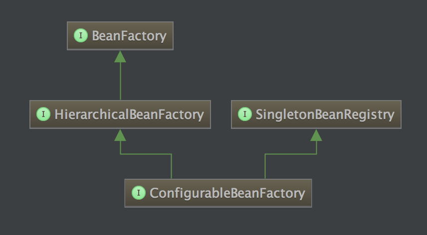 ConfigurableBeanFactory接口是在继承HierarchicalBeanFactory的基础上,实现BeanFactory的全部配置管理功能, SingletonBeanRegistry是单例bean的注册接口