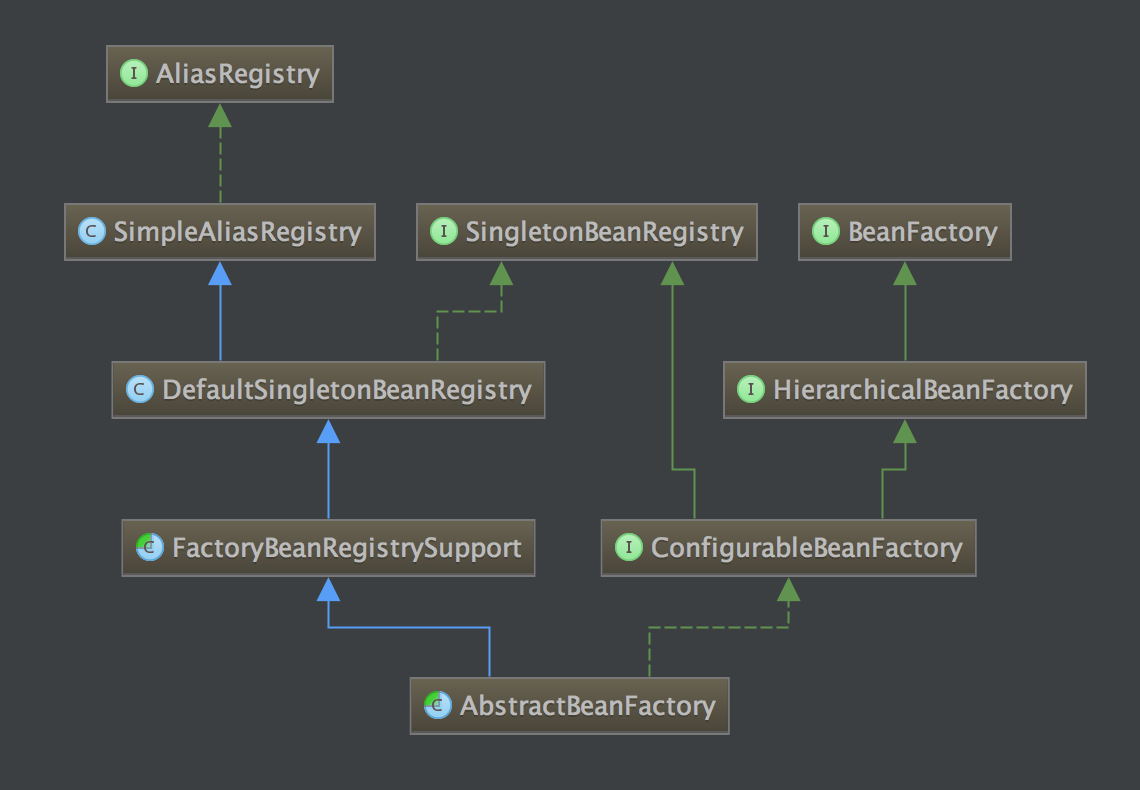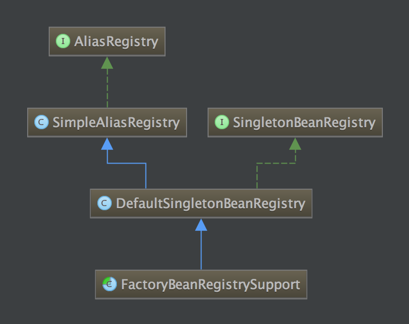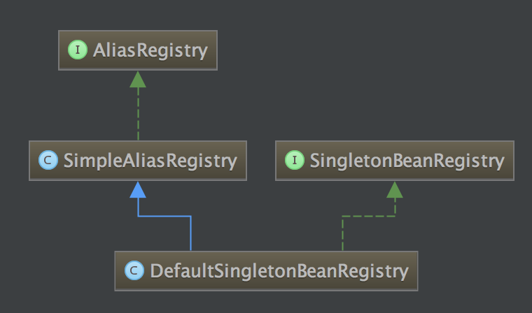 DefaultSingletonBeanRegistry是默认的实现SingletonBeanRegistry接口的类,同时,继承类SimpleAliasRegistry.