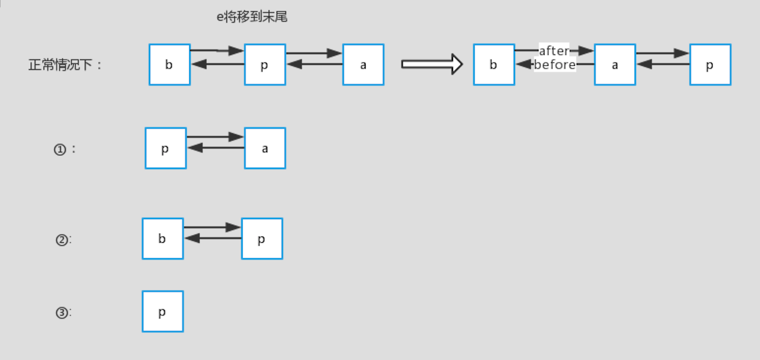 //仅当按照LRU原则且e不在最末尾,才执行修改链表,将e移到链表最末尾的操作