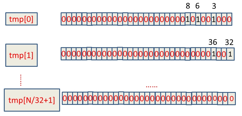 如何判断int数字在tmp数组的哪个下标,这个其实可以通过直接除以32取整数部分,例如:整数8除以32取整等于0,那么8就在tmp[0]上。另外,我们如何知道了8在tmp[0]中的32个位中的哪个位,这种情况直接mod上32就ok,又如整数8,在tmp[0]中的第8 mod上32等于8,那么整数8就在tmp[0]中的第八个bit位(从右边数起)。
