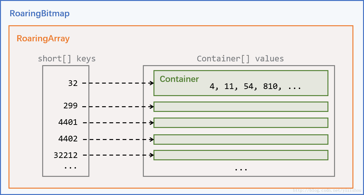 每个32位的整形,高16位会被作为key存储到short[] keys中,低16位则被看做value,存储到Container[] values中的某个Container中。keys和values通过下标一一对应。size则标示了当前包含的key-value pair的数量,即keys和values中有效数据的数量。