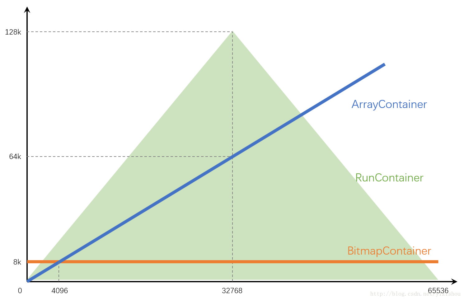 • RunContainer比较奇葩,因为和数据的连续性关系太大,因此只能画出一个上下限范围。不管数据量多少,下限始终是4字节;上限在最极端的情况下可以达到128kb。