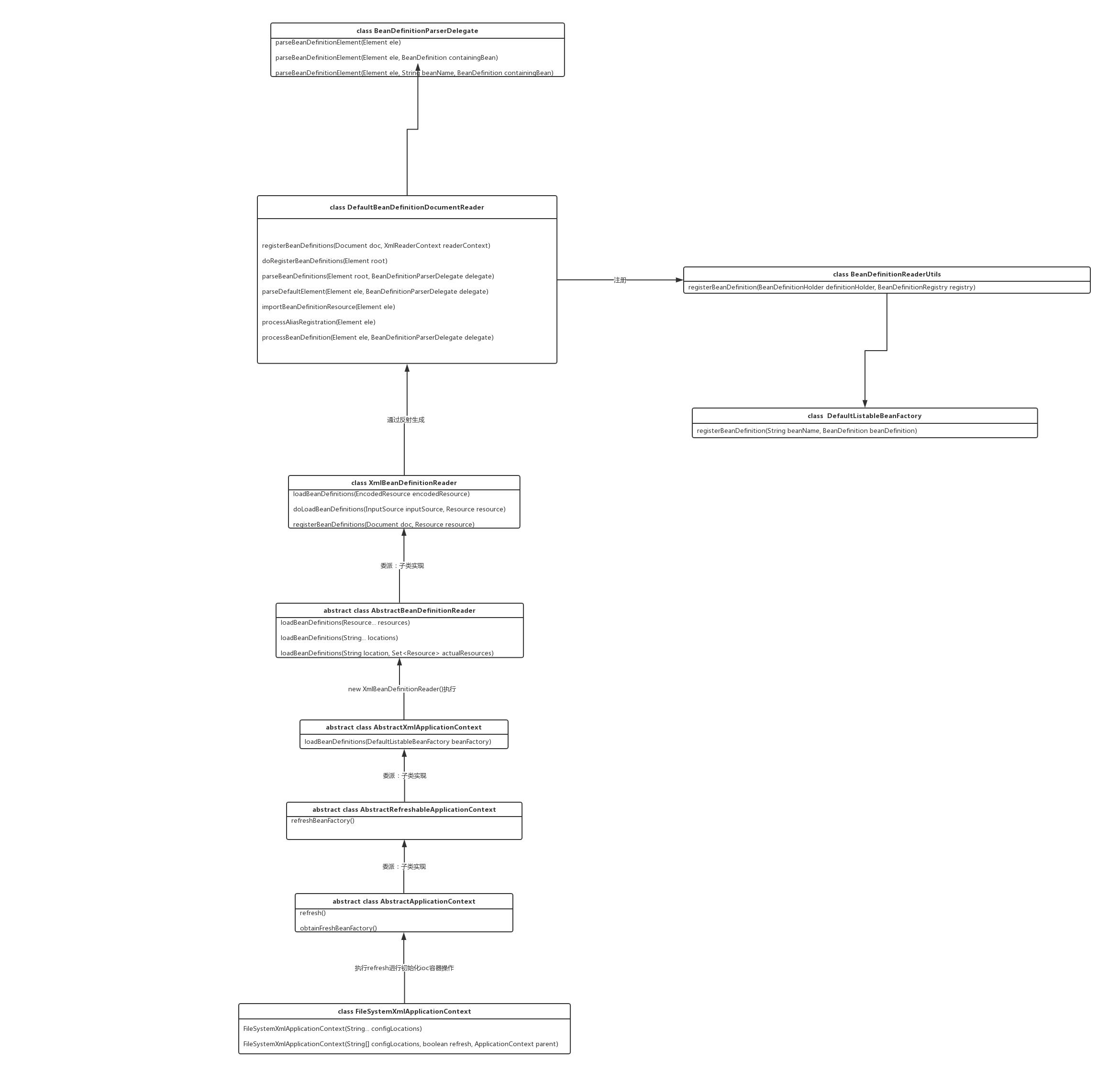 文件-实际的处理过程是委托给 BeanDefinitionParserDelegate来完成的,从而得到bean的定义信息,