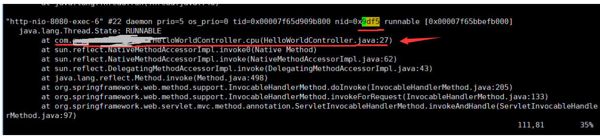 - Shift + H 切换到线程模型 找到线程执行 cpu 高的线程号