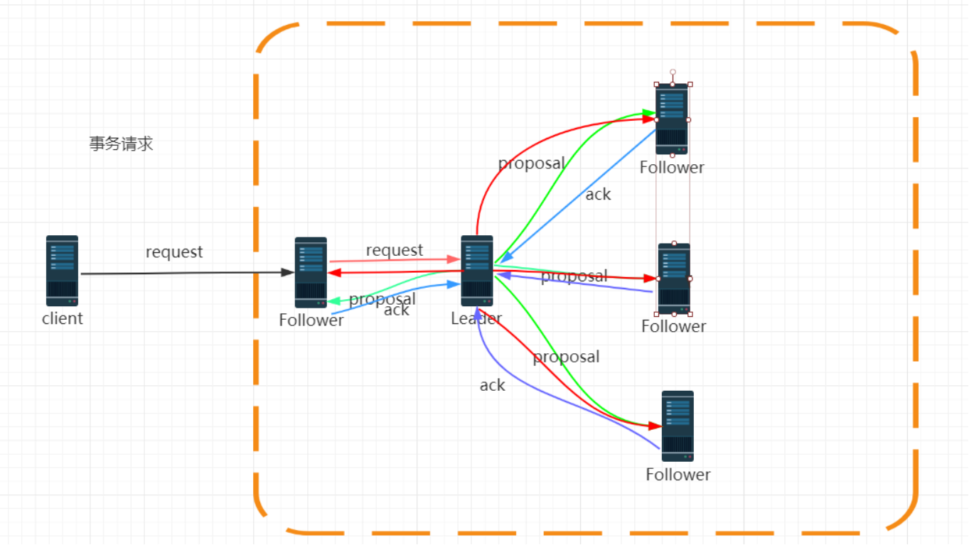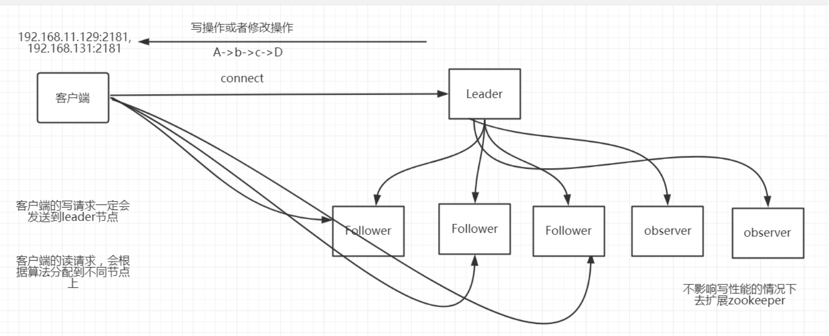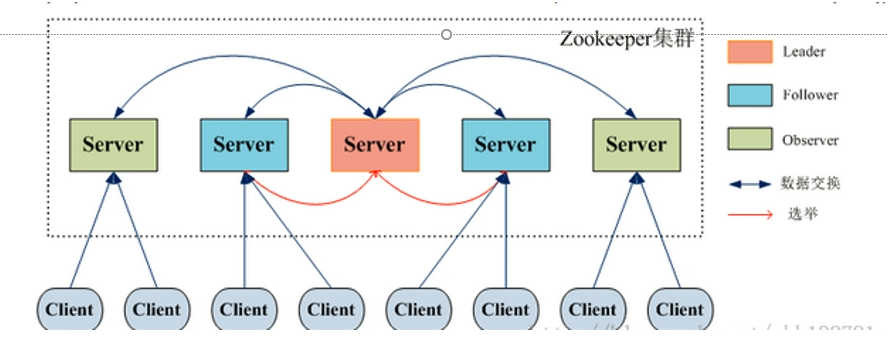 leader: 接受所有follower的提案请求并同意协调发起提案的投票,负责与所有的follower进行内部的数据交换、同步 是zookeeper集群的核心 事务请求的唯一调度者和处理者,保证集群事务处理的顺序性 集群内部各个服务器的调度者 follower: 直接为客户端服务并参数提案的投票,同时与Leader进行数据交换、同步 处理客户端非事务请求,以及转发事务请求给leader服务器 参与事务请求提议(proposal)的投票(客户端的一个事务请求,需要半数服务器投票通过以后才能通知leader commit; leader会发起一个提案,要求follower投票) 参与leader选举的投票 observer: 直接为客户端服务但不参数提案的投票,不属于zookeeper的关键部位,同时也与Leader进行数据交换、同步,observer 是一种特殊的zookeeper节点。可以帮助解决zookeeper的扩展性(如果大量客户端访问我们zookeeper集群,需要增加zookeeper集群机器数量。从而增加zookeeper集群的性能。 导致zookeeper写性能下降, zookeeper的数据变更需要半数以上服务器投票通过。造成网络消耗增加投票成本) 观察zookeeper集群中最新状态的变化并将这些状态同步到observer服务器上 增加observer不影响集群中事务处理能力,同时还能提升集群的非事务处理能力