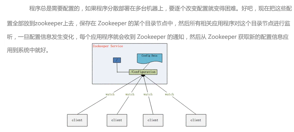订阅发布(配置中心)基于watcher机制 实现配置中心有两种模式:push 、pull。 zookeeper采用的是推拉相结合的方式。 客户端向服务器端注册自己需要关注的节点。一旦节点数据发生变化,那么服务器端就会向客户端 发送watcher事件通知。客户端收到通知后,主动到服务器端获取更新后的数据 配置数据要求: